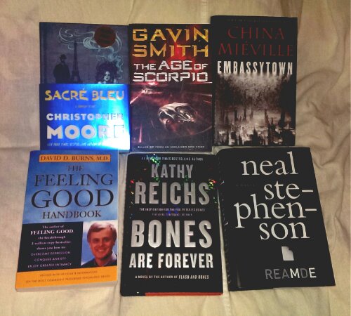 The “Feeling Good Handbook” was recommended to me by my mind technician. The Kathy Reichs book is because her books are really good. Can’t say I like the show “Bones” but the books are good. Christopher Moore is absolutely hilarious and I will read everything he writes. I suppose his genre is sort of fantasy but really, it is quite undefinable. And I could really use some cheering up right about now. The other three books are pure science fiction.